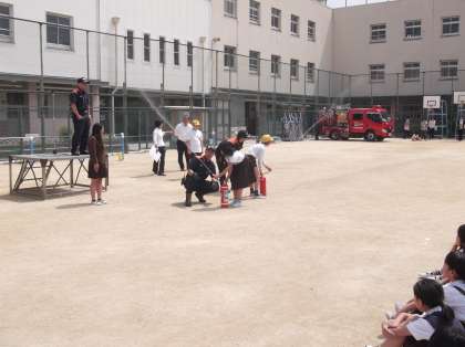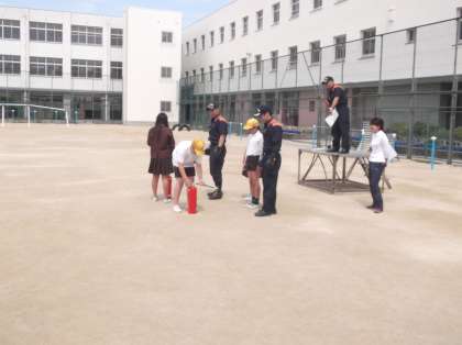 平野消防署喜連出張所から来ていただいた署員の方から操作方法を教わり、そのとおりにしてみると、消火器から勢いよく水が噴き出しました。