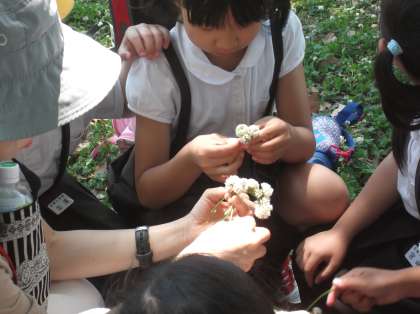 お弁当を食べた後は、広場でシロツメクサのリングを作ったり、鬼ごっこをしたりして楽しく遊びました。