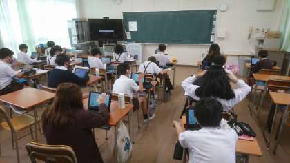 タブレットで漢字ドリルのQRコードを読み取り、