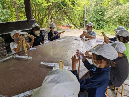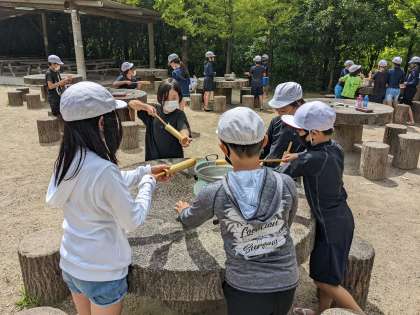 水鉄砲をつくり、遊びました。水びたしになりながら歓声をあげていました。このままいつまでも続きそうです。