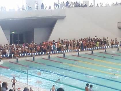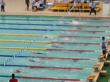 学校のプールとは勝手が違うので、途中でコースロープにつかまって助けを求める選手もいるほどでした。