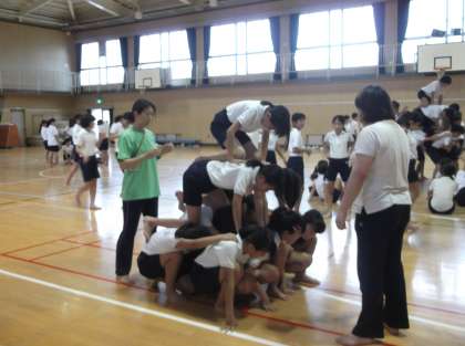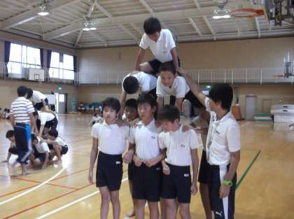 写真は3段ピラミッドで移動する練習をしている様子です。