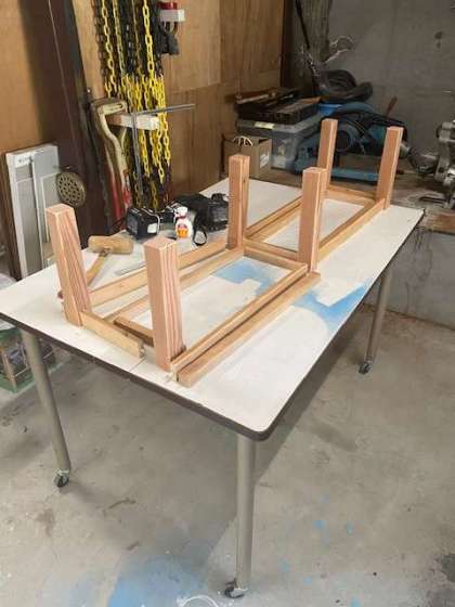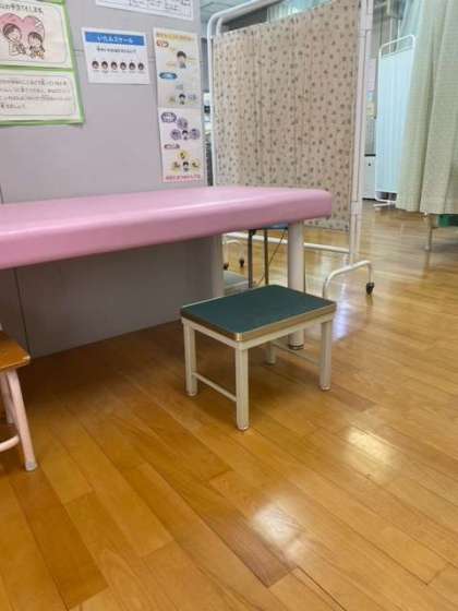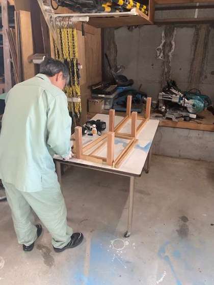保健室で低学年の児童でも処置などがしやすいように、管理作業員さんが足を置く台を作っています。