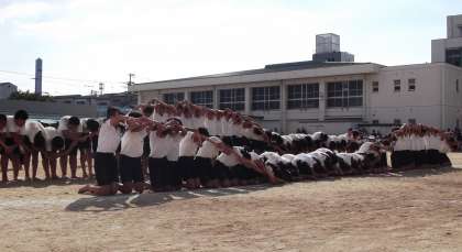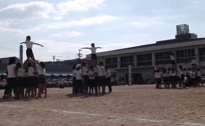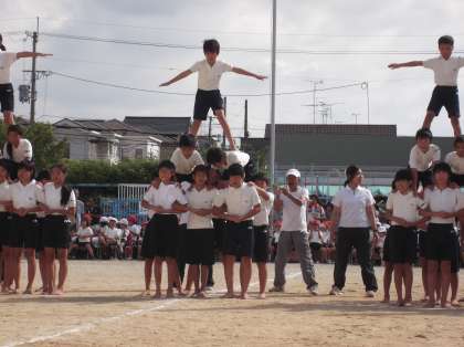 最後のプログラムは「組体操『成長』」です。6年生みんなが心をひとつにし、ひとつの目標に向かって頑張りました。土台になって痛さをこらえ踏ん張る子、掛け声をかけてみんなのタイミングを合わせようとする子、高いところへ上がりバランスを取ってポーズを決める子、どの子も素晴らしく表情も輝いていました。難しい技も決まり、会場からはたくさんの拍手が送られました。