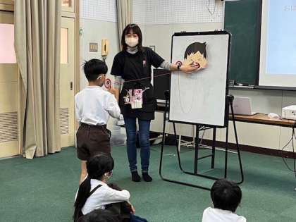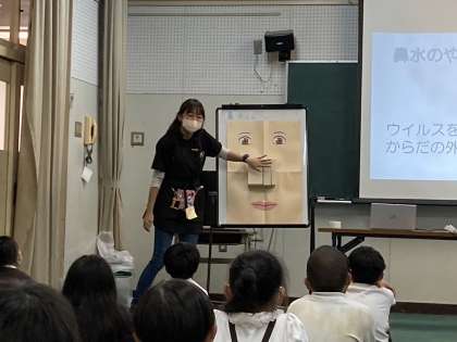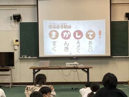 しっかり口を閉じて鼻呼吸するために、みんなで「あいうべ体操」で口の筋肉をきたえました。