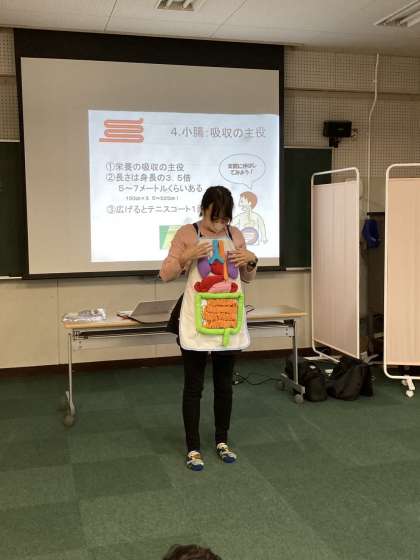 また、栄養を吸収するための器官である小腸の長さを、実際に内蔵エプロンを使って伸ばしてみました。