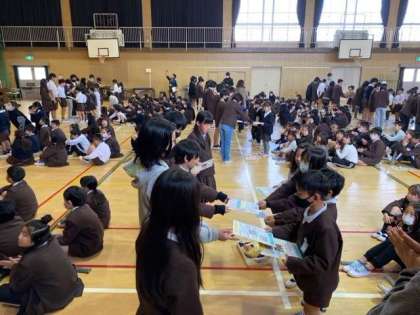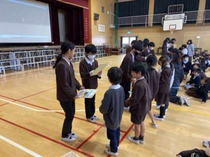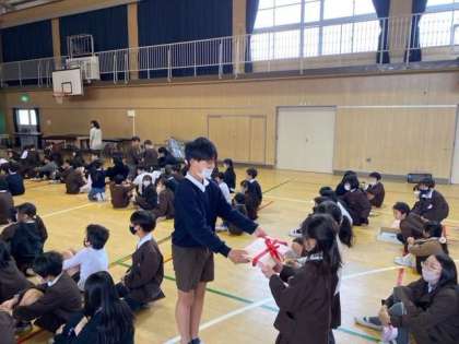 1年生から5年生は、卒業生へ書いたメッセージのプレゼントを。