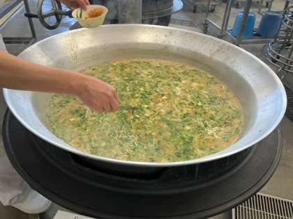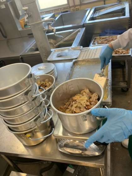 今日の献立の「とうふのみそ汁」と「豚肉のしょうが焼き」の調理や配缶のようすです。