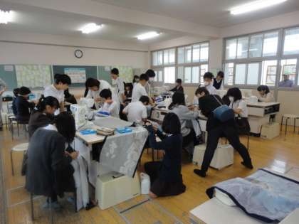 6年1組は家庭科室でミシンを使ったエプロン製作の学習でした。家庭科の実習はどの子も楽しんで学習しています。手順どおりにミシンの準備をして、慎重に縫い進めていました。