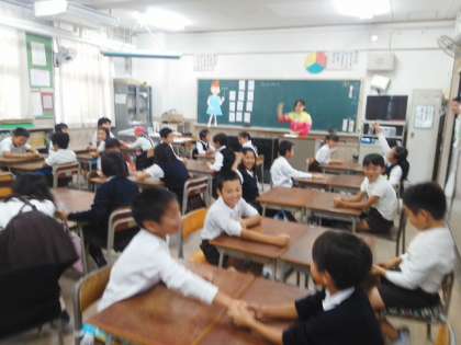 最初に、先生が指定する体の部位を表す英単語(head,mouthなど)が聞こえたら、机の上の消しゴムを素早く取る、というゲームをしました。