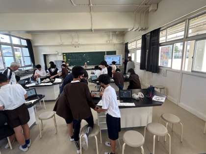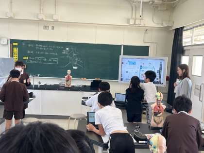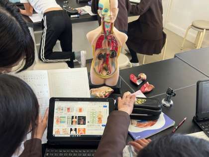 人体模型やタブレットを使って、ヒトの体や食べ物の通り道、消化や吸収について学習しています。