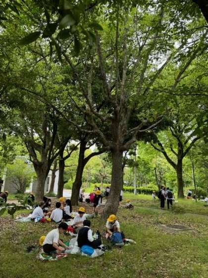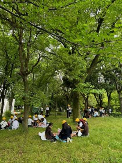 ピースおおさかの前の木陰で今からお昼ごはんです