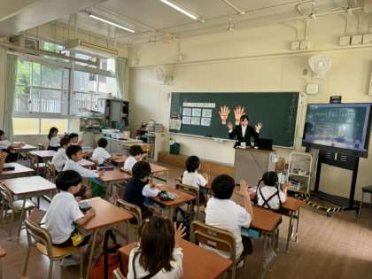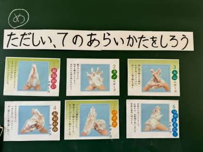 1年生で正しい手の洗い方の学習をしました。手洗いの大切さや、どんな所が汚れやすいのかなどを教えてもらいました。