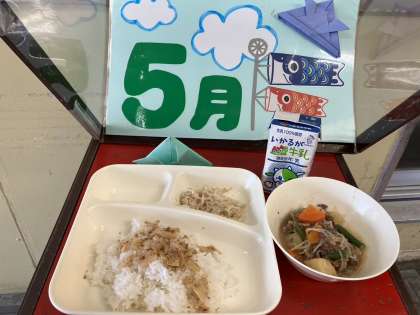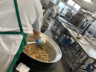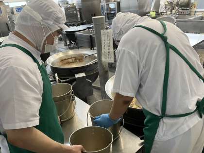 みそ肉じゃがの調理、配缶の様子です。各学年、配缶の量は、表を見て複数人でチェックしながら行っています。