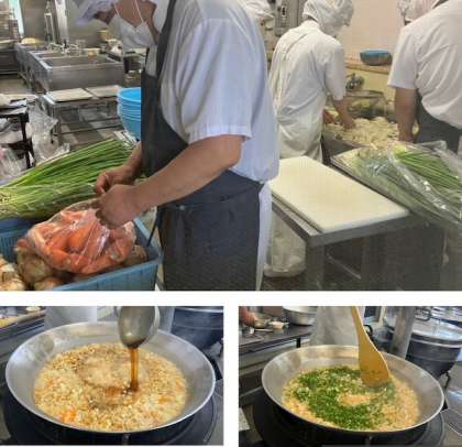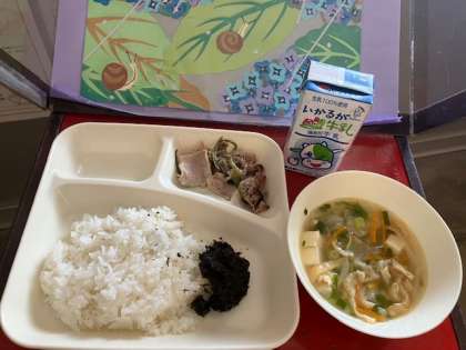 五目汁には色とりどりの野菜が使われています。豚肉の梅風味焼きは、梅が爽やかさを与えてくれています。