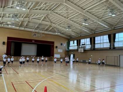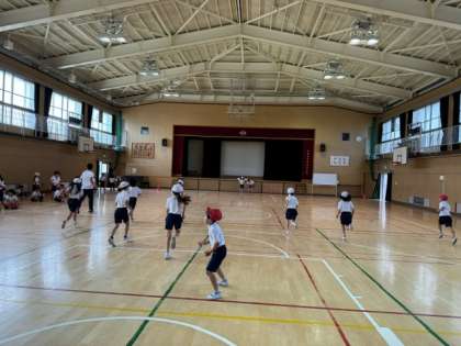3年生は、体育館でシャトルランをしました。先生たちも子どもに混じって頑張っていました。