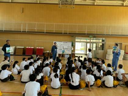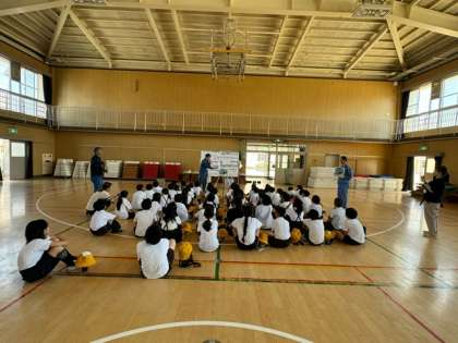 場所を体育館に移し、パッカー車に関する事や、ゴミの分別の仕方などを学びました。