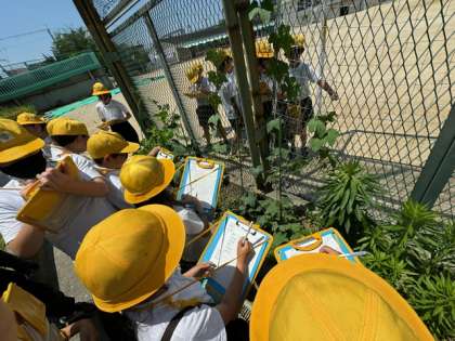 ヘチママやヒョウタンの観察をしました。葉の色や形などよく見てメモに書いていました。