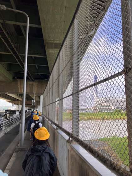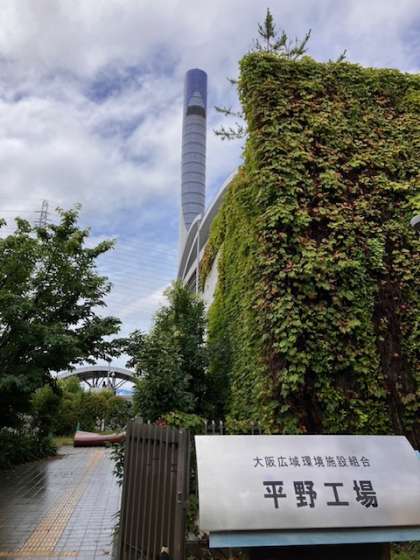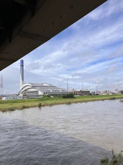 あいにくの雨ですが、平野焼却工場に向かって出発しました。朝の雨の影響で、川の流れが強くなっていました。到着する頃には雨が上がってきました。