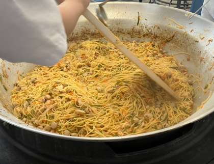 チキントマトスパゲッティは鶏肉、ウインナーを主材にたまねぎ、トマト缶、にんじん、ピーマンを使用して、バジルで風味をつけたトマト味のスパゲッティです。