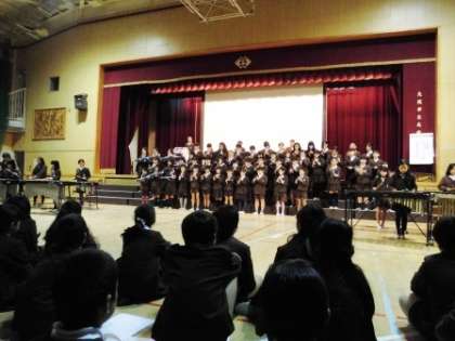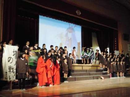 有名な戦記物語である平家物語の世界を、迫力ある群読と、衣装や小道具を工夫しての演技で、情感豊かに表現しました。優しい旋律の歌、にぎやかで明るい合奏にも、練習の跡が感じられました。