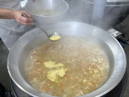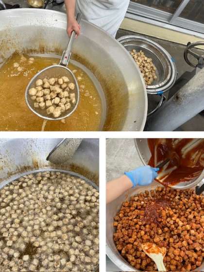油で揚げたまぐろに、ケチャップ、砂糖、赤みそを合わせたソースからませています。
