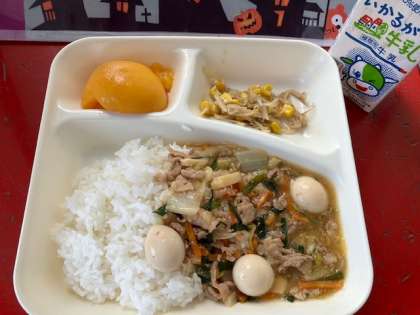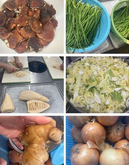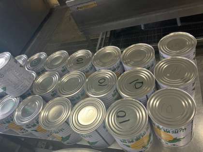 中華丼にはたくさんの具が入っています。黄桃の缶詰、瓜破小学校のみんなが食べれるよう、たくさん缶を開けています。