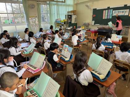 けんばんハーモニカの練習をしました。先生の合図で、みんなで揃えて音を出しました。