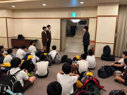 宿舎の方を前に、開舎式を行いました。買い物や入浴、就寝時間など楽しみがいっぱいあるそうです。