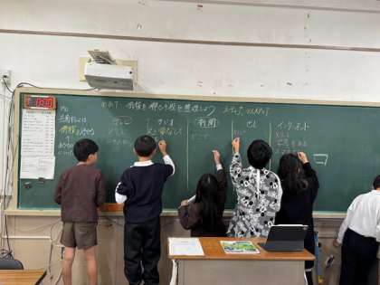 情報を得る手段について考える学習をしました。色々なマスメディアのメリット、デメリットを調べて考え、意見をノートに整理しました。