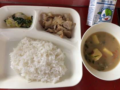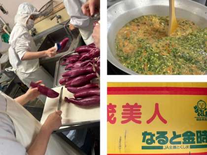 みそ汁のさつまいもは、徳島県産のなると金時です。みそ汁があまじょっぱくて、美味しいです。