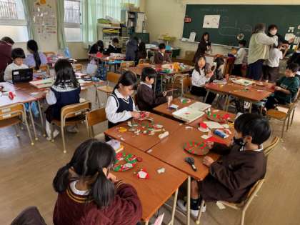図工でクリスマスリースをつくりました。丁寧にのりづけをしたりしながら、楽しく活動できました。