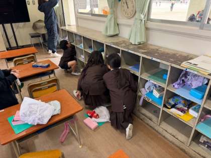 寒いので、ぞうきんを絞るのも大変です。それでも、お世話になった机やロッカーをきれいにしていました。