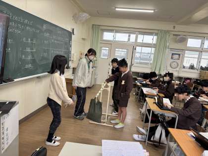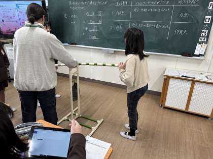 小さい力で持ち上げることができる「てこ」の働きについて学習しました。予想を立て、条件を変えながら実験していました。