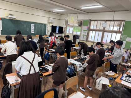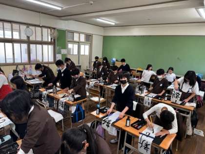 書き初め大会を行いました。集中を高めて、書き初めにふさわしいBGMをバックに頑張りました。