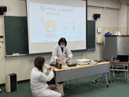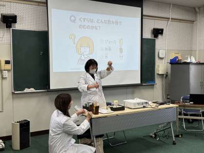 薬の正しい服用の仕方については、実験を通してお話しされました。間違った服用をしてしまうと、効果が薄まったり副作用が強く出てしまったりすることがわかりました。