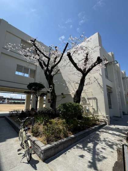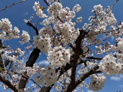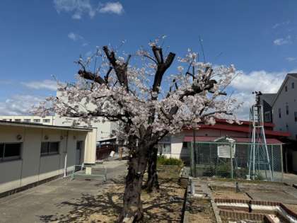 今日の午前中はきれいな青空でした。学校の桜も満開になりました。入学式、始業式まできれいに咲き続けてほしいです。