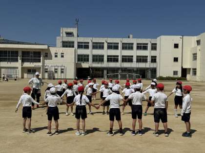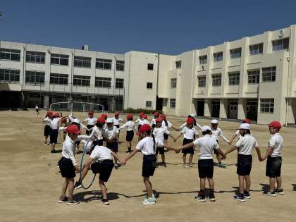 手をつないだまま、順にフラフープを回していく運動では、グループで協力して取り組んでいました。