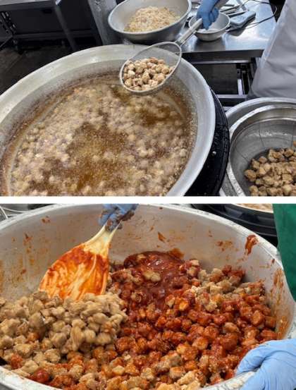 人気メニューのまぐろのオーロラ煮が出ました。大きな釜で大量のまぐろを揚げていきます。