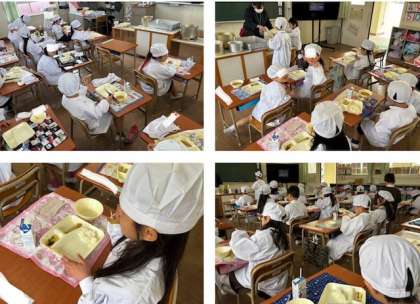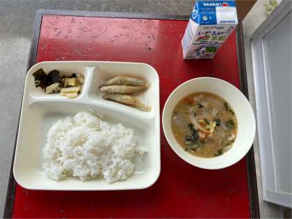 わかめとたけのこを煮た「わかたけ煮」。春を感じるメニューです。1年生のこども達も楽しく給食時間を過ごしています。