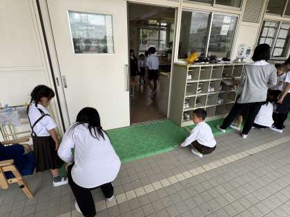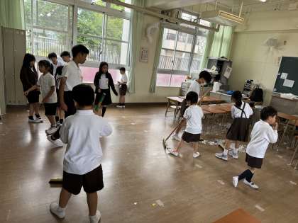 1年生の児童は、まだ慣れないながらも、教えてもらったほうきや雑巾を使って掃除していました。