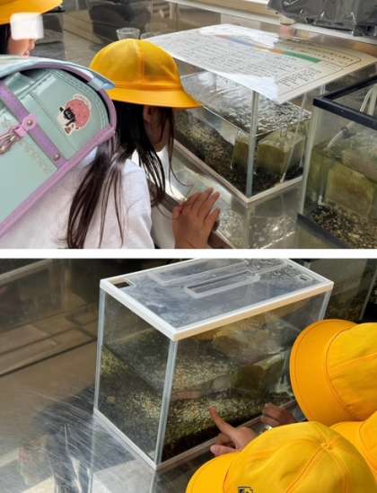 2年生数名と先生が、なぜか理科室にいました。行ってみると、必死に水槽を眺めています。聞くと、おたまじゃくしからカエルに変化したばかりの様子に見入っていたとのこと。不思議な姿に釘づけの子どもたちでした。