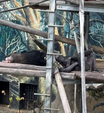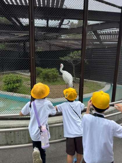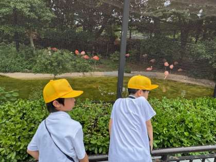 ツル、フラミンゴ、チンパンジーを見ました。チンパンジーは、寝ていました。