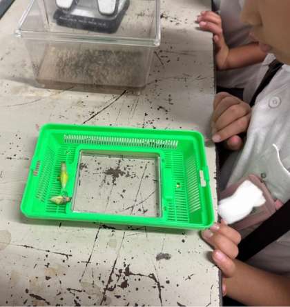 教室の後ろには、クラスで飼っている生き物がありました。