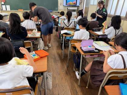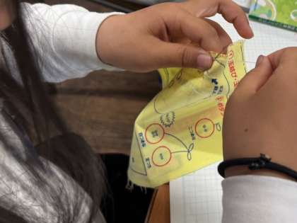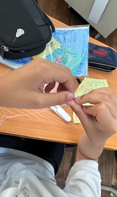 玉結び、玉止めなどの基本を練習しました。まだ難しいみたいで、先生2人で支援しながら取り組んでいました。