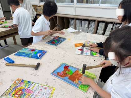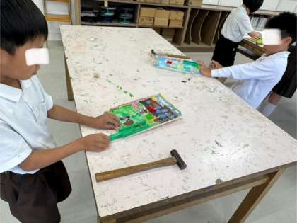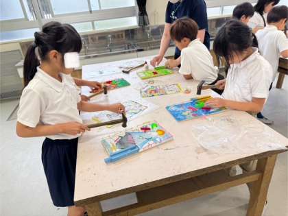 くぎを工夫して打ち込み、ビー玉のパチンコを製作しました。