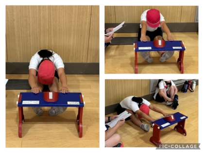 体育館で新体力テスト(スポーツテスト)を行いました。長座体前屈と立ち幅跳びの測定を行いました。