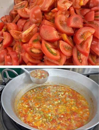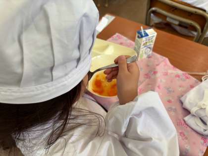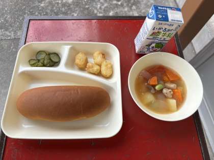 「フレッシュトマトのスープ煮」は、生のトマトを使っています。たまねぎやにんじん、じゃがいもなど、たくさんの食材と一緒に煮込み、色鮮やかに仕上げています。