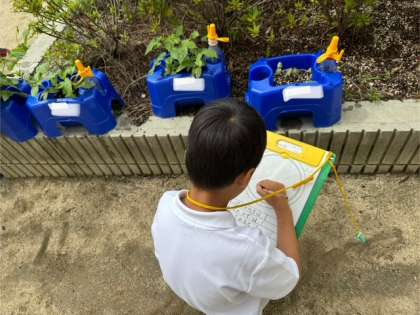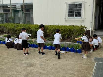 アサガオの観察をしている様子です。「先生、アサガオめっちゃのびてる」と教えてくれた子もいます。
