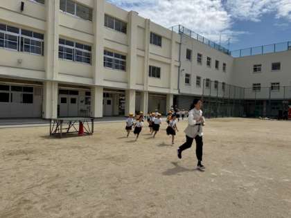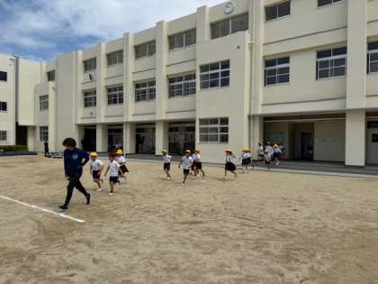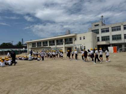 1次避難として運動場に集まります。お(おさない)、は(はしらない)、し(しゃべらない)、も(もどらない)を意識しながら避難していました。